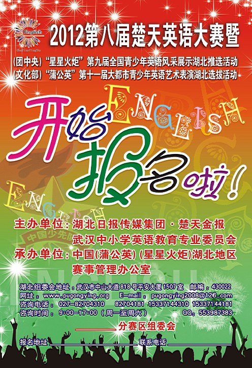 为落实<<中共中央国务院关于进一步加强和改进未成年人思想道德建设的若干意见>>精神,丰富青少年的业余文化生活,提高青少年学习英语的兴趣,促进青少年英语教育事业发展,体现英语教育的实用性,以实际行动迎接入世,为广大青少年英语爱好者提供展示才华和交流学习的机会,在2005年成功举办了首届楚天英语大赛的基础上,今年 “湖北报业集团楚天金报”决定于2012年10月至2013年元月举办第八届楚天英语大赛,由“武汉市中小学英语教育专业委员会”大力支持并进行专业指导。本次大赛将在全省有条件的各地区设立分赛区,在各分赛区进行初赛。各分赛区初赛中胜出的优秀选手于12月份参加在武汉举行的湖北地区复赛。通过复赛选拔产生的金、银奖的选手有资格代表湖北进京参加2013年2月由团中央主办的《第九届“星星火炬”全国青少年英语风采展示活动》或暑期由文化部主办的“蒲公英”《第十一届大都市青少年英语艺术表演选拔活动》。