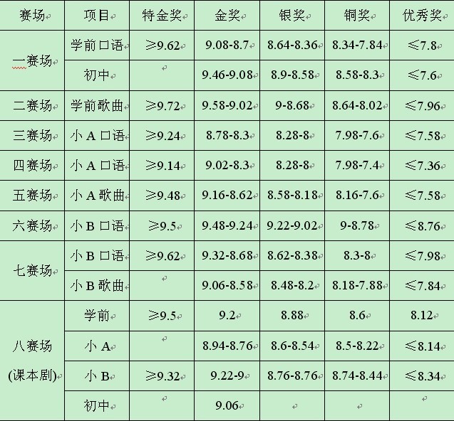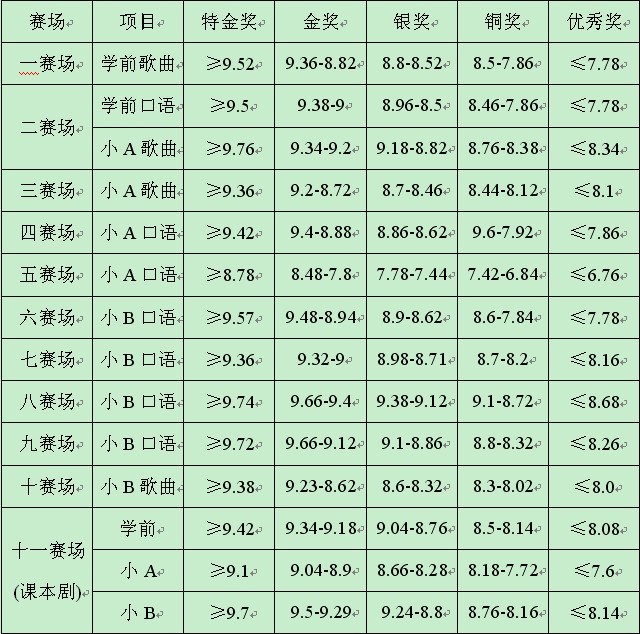 为保证评奖的公正、公平性,避免选手在不同赛场不同评委评分尺度不同,造成分数差异而引起某个赛场得奖集中的现象,本次大赛按上述评奖比例分赛场、分组别划分分数,例如:假如第一赛场学前参赛人数为100,则评出学前组特金奖1名,金奖15名;小学A参赛人数为100,则评出小学A特金奖1名,金奖15名,依此类推。因此不同赛场,同组别、同项目、同分数可能奖项不同。现将每个赛场、组别的分数线公布如下: