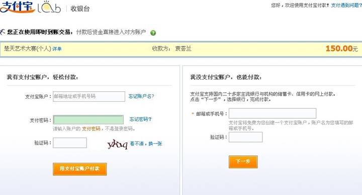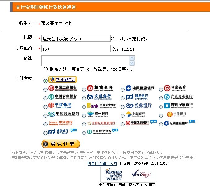 请勿修改标题,付款金额为系统自动生成,初赛个人节目150元/人,组合节目100元/人,选手可以将个人信息填写在备注栏,(个人报名)例如:丁俊晖,11岁,钢琴 ;(组合报名)例如:张怡宁、王亚楠、郭焱等5人组合,集体舞。填写完毕后选择支付方式,提交后显示以下界面:
