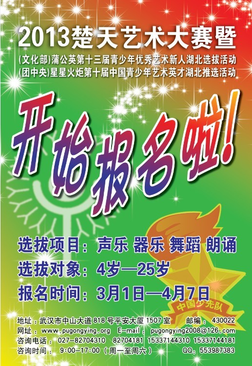 为贯彻落实“第五次全国少代会”精神,以及党对全国少年儿童“勤奋学习、快乐生活、全面发展”的殷切期望,弘扬社会主义先进文化,促进青少年艺术教育,丰富青少年业余文化生活。由湖北日报传媒集团·楚天金报、蒲公英、星星火炬湖北赛事管理办公室、湖北省音乐家协会儿童专业委员会主办的,2013(第九届)楚天艺术大赛暨“蒲公英”第十三届青少年优秀艺术新人湖北选拔活动、“星星火炬”第十届中国青少年艺术英才湖北推选活动将于2013年2月在全省展开。2013楚天艺术大赛以(声乐、器乐、舞蹈、朗诵)艺术形式为青少年提供表现才华的舞台。本次大赛将在全省各地区设立分赛区,在各分赛区进行一次选拔(初赛),各分赛区获得一等奖、二等奖、三等奖的选手有资格参加全省的决赛(在武汉音乐学院新校区A、B栋);湖北省决赛获得特金、金、银奖的选手有资格代表湖北进京参加2013年7月在北京举行的由文化部(中华儿童文化艺术促进会)主办的“蒲公英”第十三届青少年优秀艺术新人选拔活动或由团中央(中国少年先锋队事业发展中心)主办的第十届“星星火炬”中国青少年艺术英才推选活动。具体事宜如下