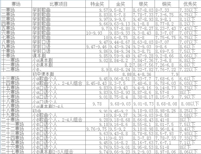 本次英语大赛在大家的努力和积极参与下圆满结束了,一份耕耘一份收获,现在到了收获的时候了。决赛成绩请于12月23日上网(成绩查询栏目)查询或致电组委会,奖证领取方法及地点详见网上获奖名单备注栏。湖北省决赛设特金奖(1%)、金、银、铜、优秀奖,比例分别为15%、20%、30%、34%。为保证评奖的公正、公平性,避免选手在不同赛场不同评委评分尺度不同,造成分数差异而引起某个赛场得奖集中的现象,本次大赛按上述评奖比例分赛场、分组别划分分数,例如:假如第一赛场学前参赛人数为100,则评出学前组特金奖1名,金奖15名;小学A参赛人数为100,则评出小学A特金奖1名,金奖15名,依此类推。因此不同赛场,同组别、同项目、同分数可能奖项不同,各赛场分数线如下: