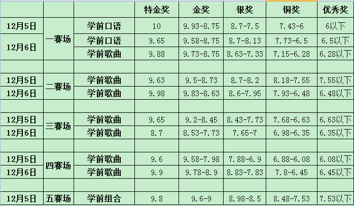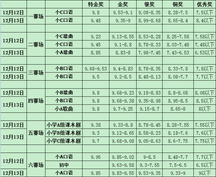 为保证评奖的公正、公平性,避免选手在不同赛场不同评委评分尺度不同,造成分数差异而引起某个赛场得奖集中的现象,本次大赛按上述评奖比例分赛场、分组别分项目划分分数,例如:假如第一赛场小学A组英语口语个人节目参赛人数为100,则评出小学A组特金奖1名,金奖15名;小学B组英语歌曲组合节目数为100,则评出小学B组特金奖1名,金奖15名,依此类推。因此不同赛场,同组别、同项目、同分数可能奖项不同。现将每个赛场、组别的分数线公布如下: